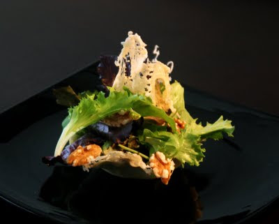 Para emplatar colocamos una base de queso granna padano, sobre este los brotes tiernos, luego espolvoreamos con las nueces y finalmente bañamos la ensalada con la vinagreta.